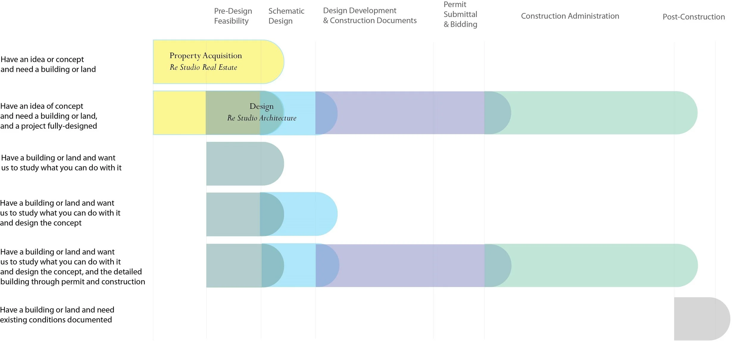 Not sure where to start? We offer a variety of services packages to meet you where you are. Whether you are acquiring property, developing, or reimagining your existing space for growth, our integrated real estate advisory and full-service architectural services are designed to give you the clarity and confidence to move forward with your project, delivering enduring and responsive solutions tailored to your needs.